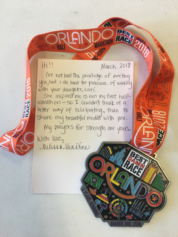 The last year of my mom’s life I would run every race for her and when I would fly up for her next doctor’s visit I would bring her that month’s medal. The medals were a source of strength for her to turn to when she felt she was at the bottom of her barrel. In that year of races, I would have to miss one due to injury. I was disappointed that I would not have a medal to give my mom that month but she understood. Then weeks later I got a call from my mom who was crying, absolutely moved by the selflessness of another. She says to me, “Did you know she was going to do this?” and me not knowing what she is referring to says “No” at which point she reads the letter that accompanied the medal, as pictured above. My mom was moved to tears and I was moved beyond words. This is showing up.