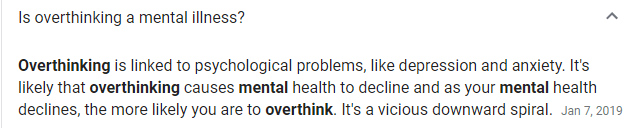 I Googled “overthinking and the excerpt above came up. It is absolutely on-point. The reality is that the more you think, the more you obsess, the more anxiety that surrounds the situation and the spiral begins. Additionally the article attached to the excerpt above notes: